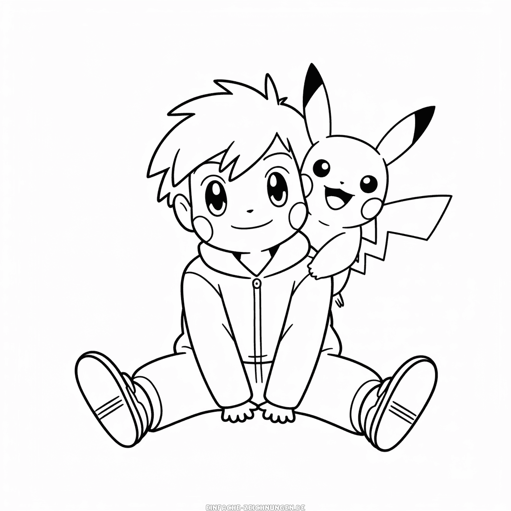 Einfache Zeichnung von Ash Ketchum mit Pikachu Pokémon kostenlos zum Ausdrucken, diese fröhliche Szene zeigt Ash und seinen treuen Freund Pikachu, perfekt für kleine Pokémon-Fans. Einfaches Ausmalbild zum Nachzeichnen oder Ausmalen für Kinder. Hochauflösendes Bild, ideal für den schwarz-weißen PDF-Druck im A4-Format.