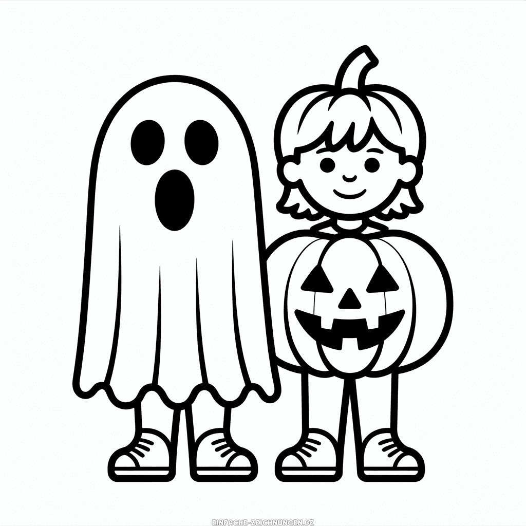 Einfache Zeichnung von Halloween Kinder kostenlos zum Ausdrucken, ein fröhliches Halloween-Motiv mit freundlichen Geistern und Kürbissen, perfekt für die kleinen Künstler. Einfaches Ausmalbild zum Nachzeichnen oder Ausmalen für Kinder. Hochauflösendes Bild, ideal für den schwarz-weißen PDF-Druck im A4-Format.