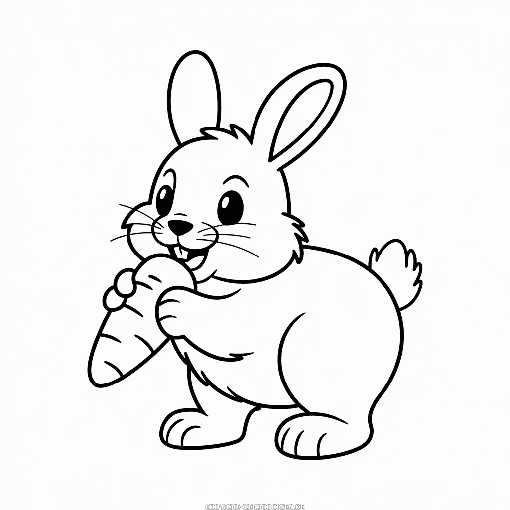 Einfache Zeichnung von Kaninchen und Karotte kostenlos zum Ausdrucken, ein niedliches Kaninchen, das neugierig auf eine Karotte schaut. Einfaches Ausmalbild zum Nachzeichnen oder Ausmalen für Kinder. Hochauflösendes Bild, ideal für den schwarz-weißen PDF-Druck im A4-Format.