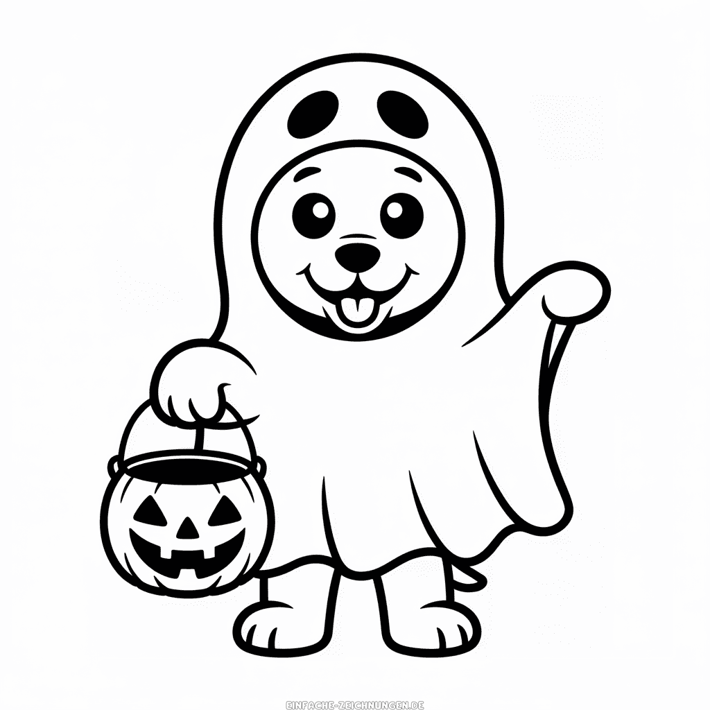 Einfache Zeichnung von Niedlicher Halloween-Hund kostenlos zum Ausdrucken, ein freundlicher Hund mit einem lustigen Halloween-Kostüm wartet darauf, von kleinen Künstlern entdeckt zu werden. Einfaches Ausmalbild zum Nachzeichnen oder Ausmalen für Kinder. Hochauflösendes Bild, ideal für den schwarz-weißen PDF-Druck im A4-Format.