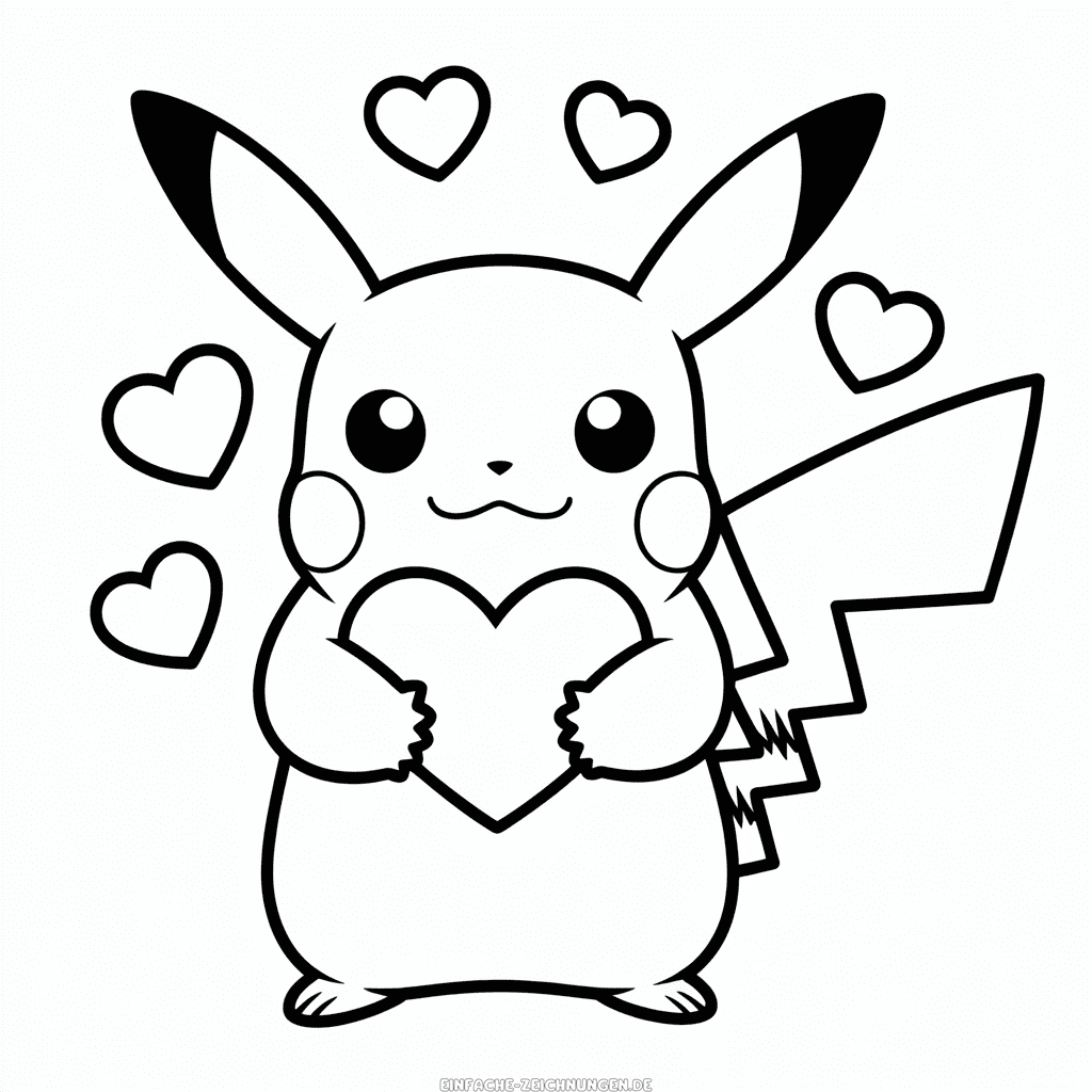 Einfache Zeichnung von Pikachu mit Herz kostenlos zum Ausdrucken, ein süßes Bild unseres Lieblings-Pokémons, das ein Herz umarmt, perfekt für kleine Pokémon-Fans. Einfaches Ausmalbild zum Nachzeichnen oder Ausmalen für Kinder. Hochauflösendes Bild, ideal für den schwarz-weißen PDF-Druck im A4-Format.